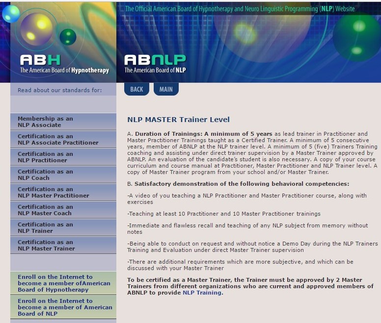 A Master Trainer of NLP, is someone who can deliver NLP Trainers Training and issue an NLP Trainers certificate to an NLP Trainer. There are very few NLP Master Trainers in the UK and to give you an idea of how much a person needs to complete within the field of NLP to obtain this title, here are the guidelines set out by the ABNLP accreditation body for their own students: